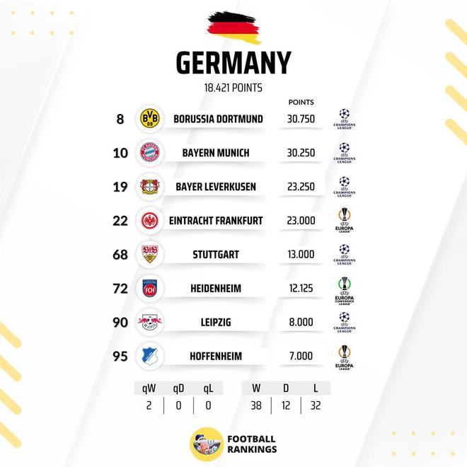 德甲歐戰(zhàn)排名:多特第8,拜仁第10,萊比錫第90。